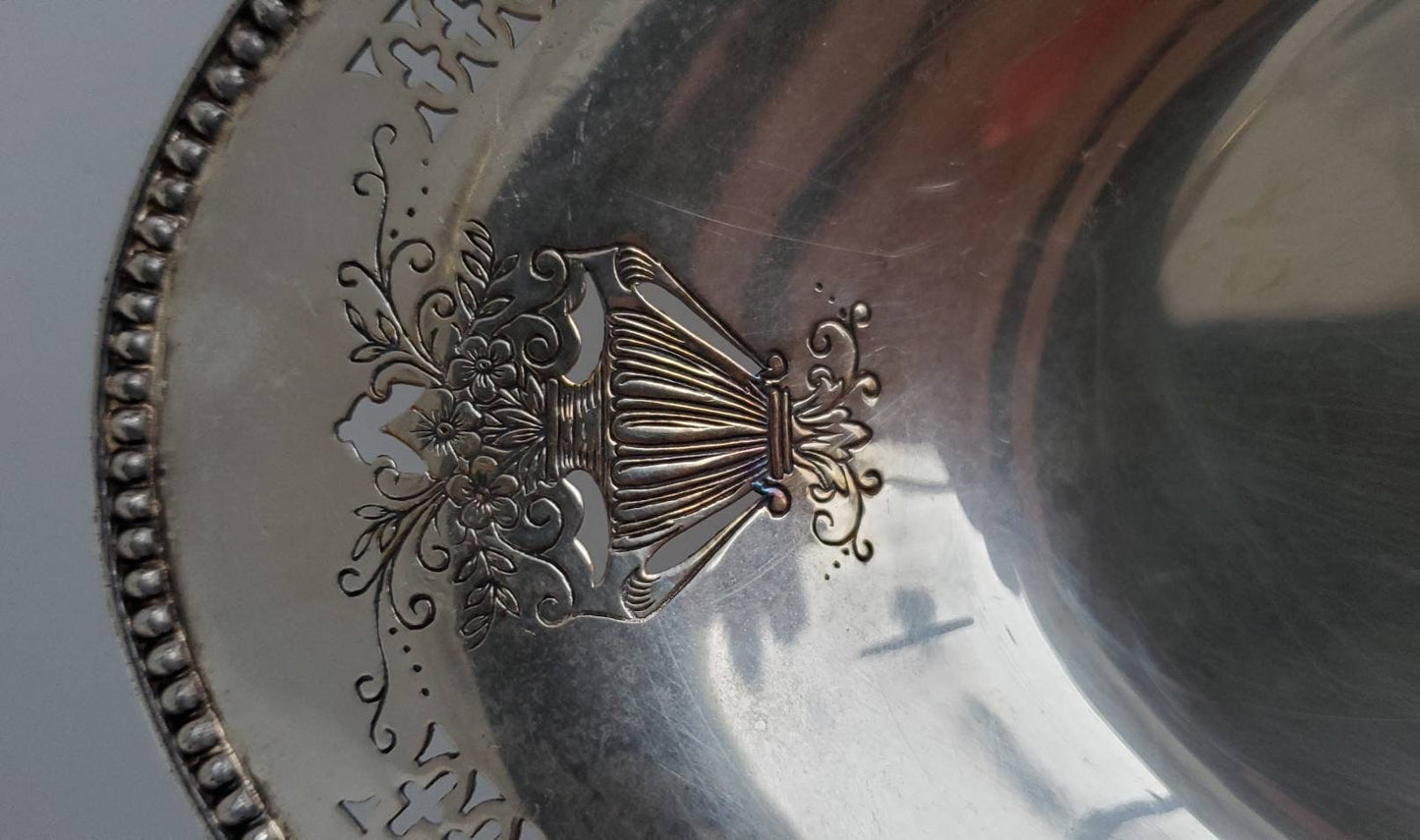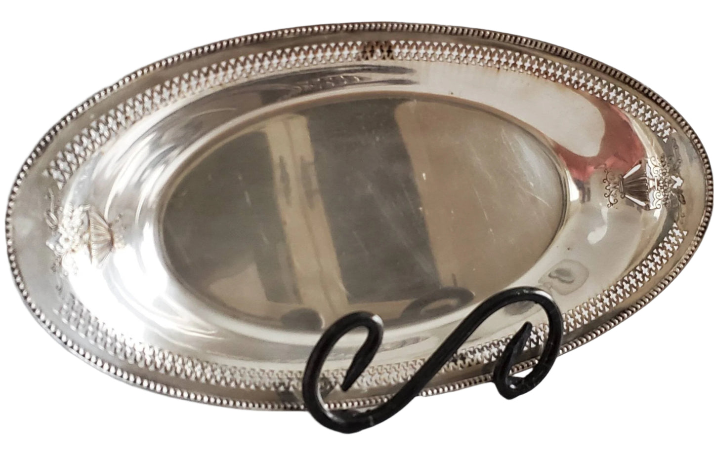 I love this little bread platter. The back is stamped "Heirloom Plate," and has a lovely filigree pattern around the edge, with a floral design on each end made with a combination of embossing and piercing.