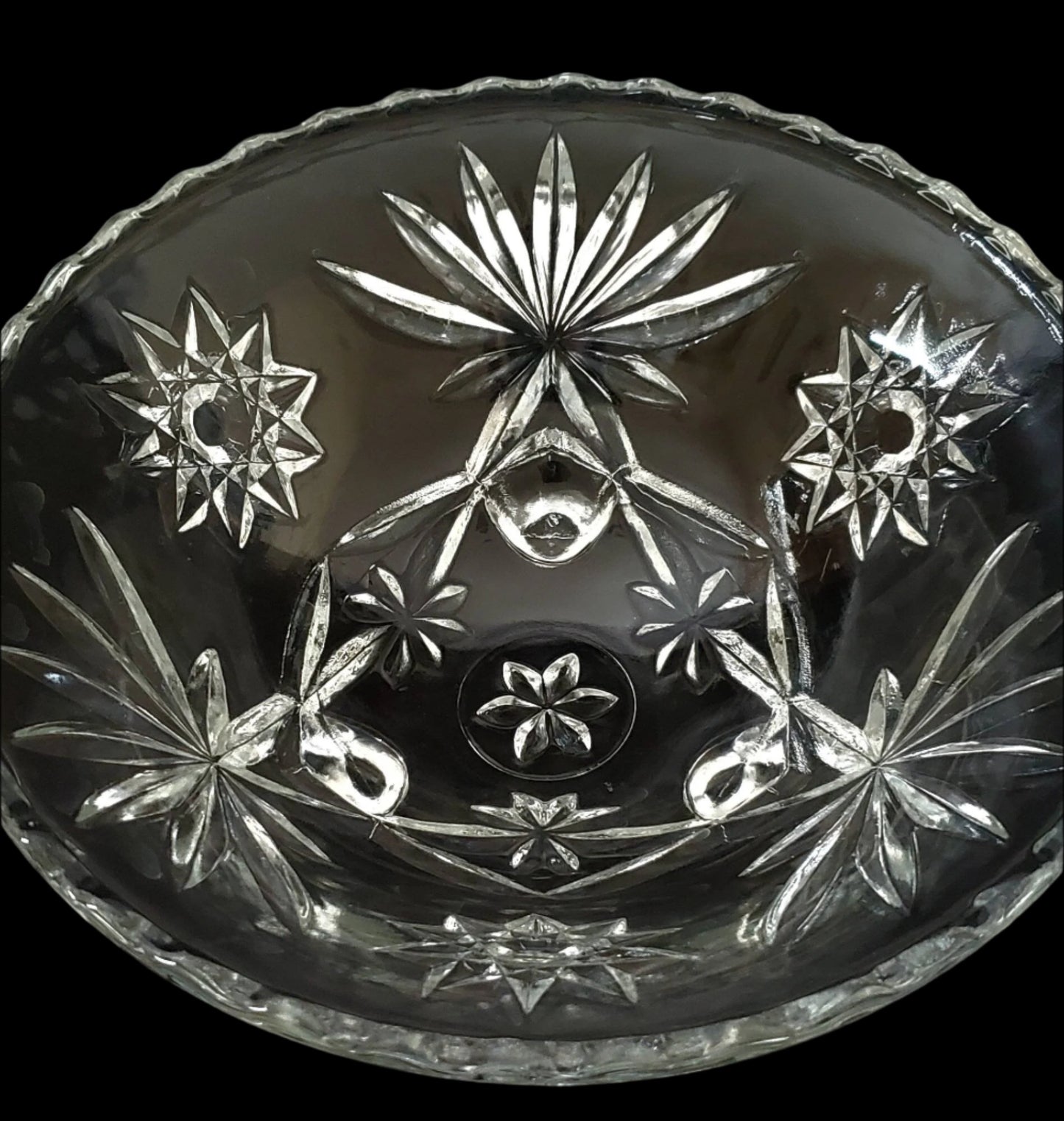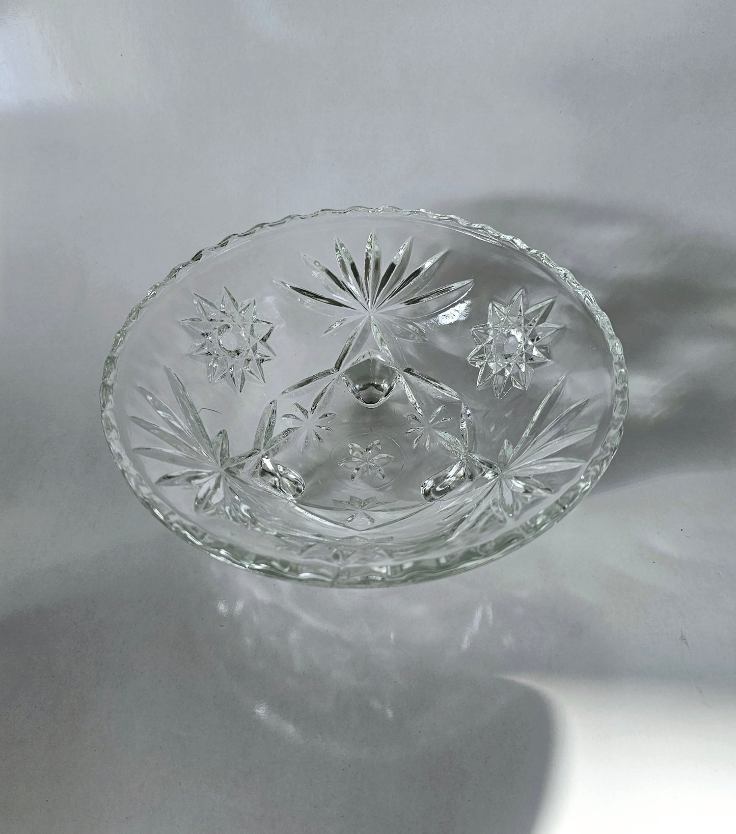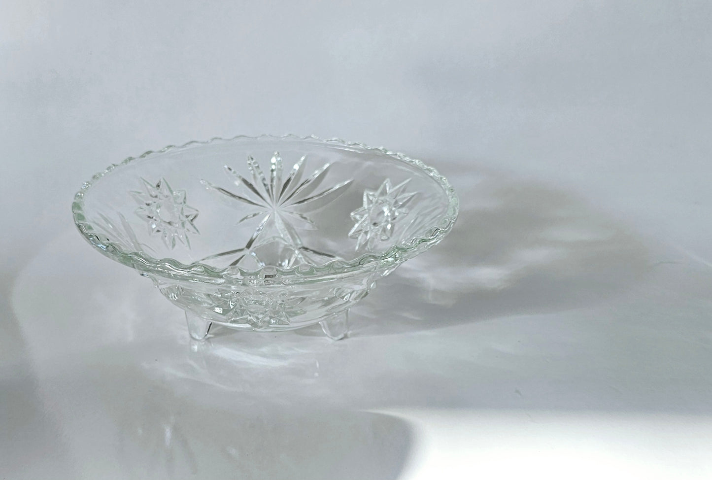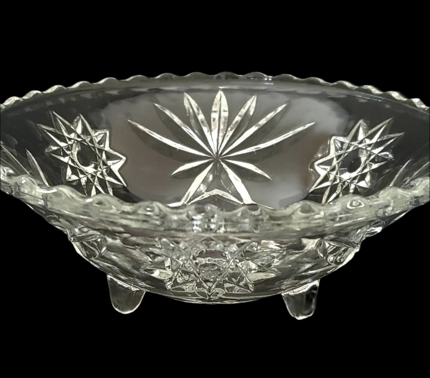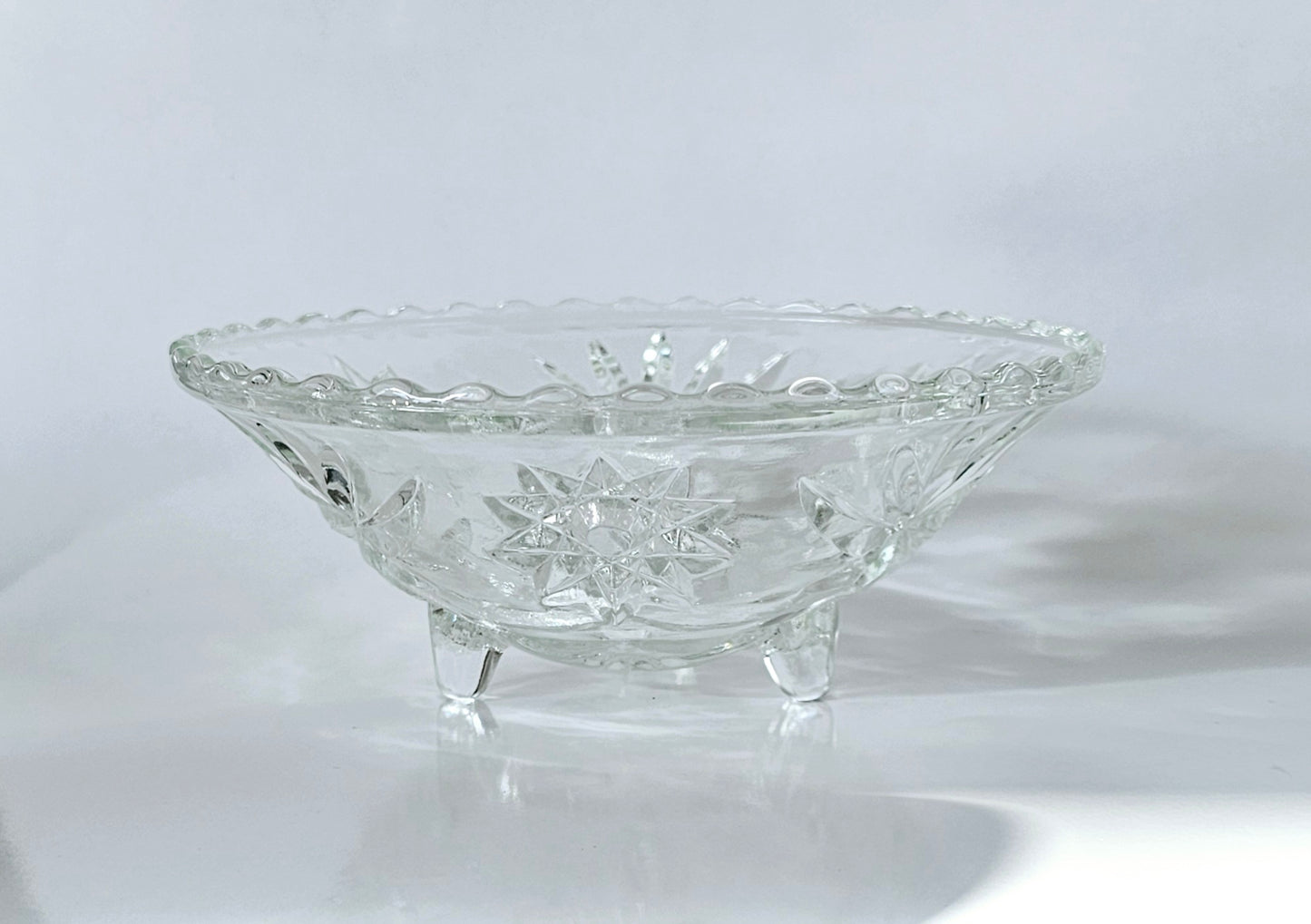 From Anchor Hocking, this three-footed dish is is for your bon-bons......or your candy, keys, nuts, mints - whatever you want to put in it! It's decorated with starbursts and Star of David patterns.